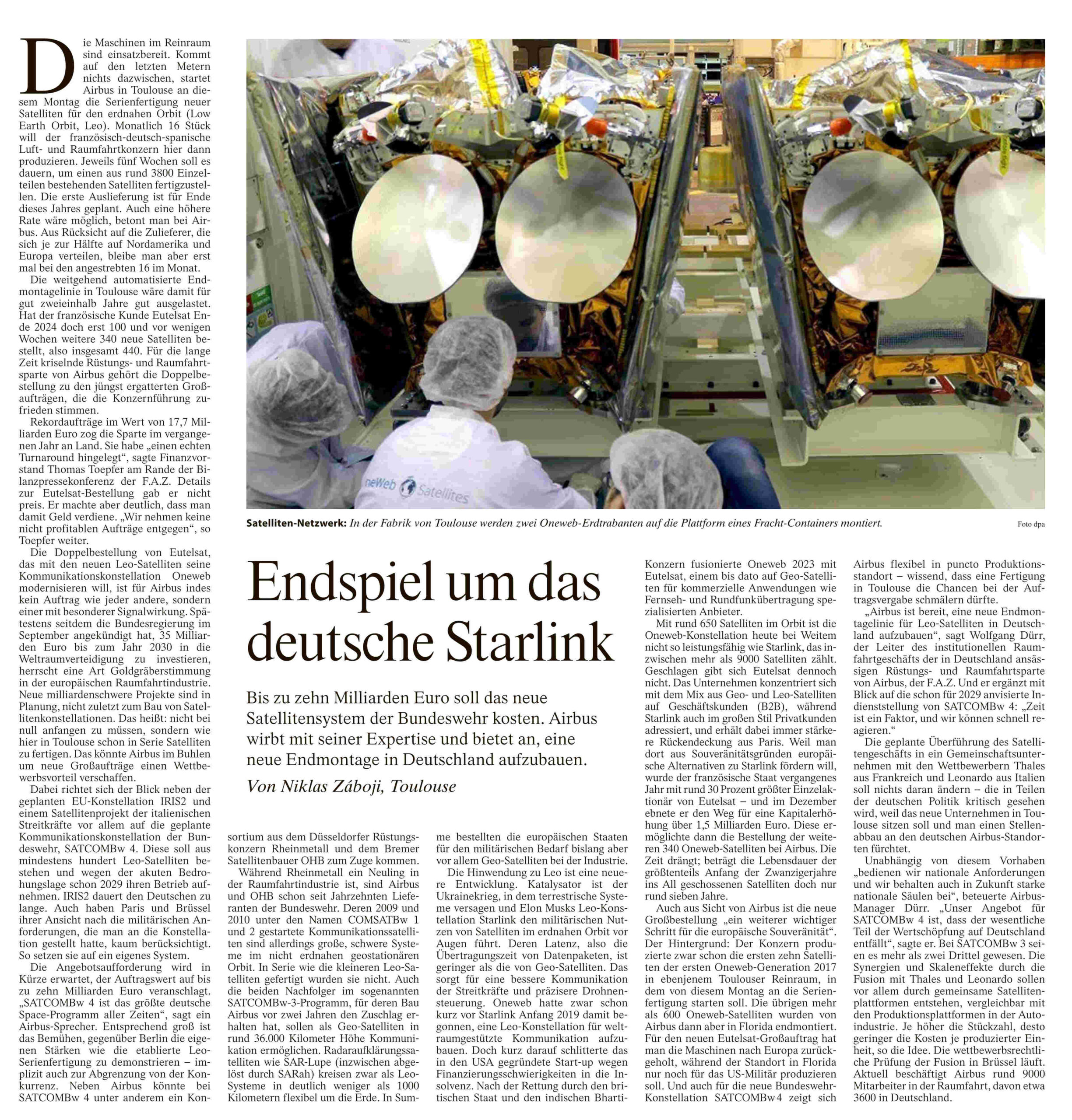 Le nouveau système satellitaire des forces armées allemandes devrait coûter jusqu’à dix milliards d’euros. Airbus met en avant son expertise et propose de construire une nouvelle usine d’assemblage final en Allemagne. Par Niklas Záboji, Toulouse